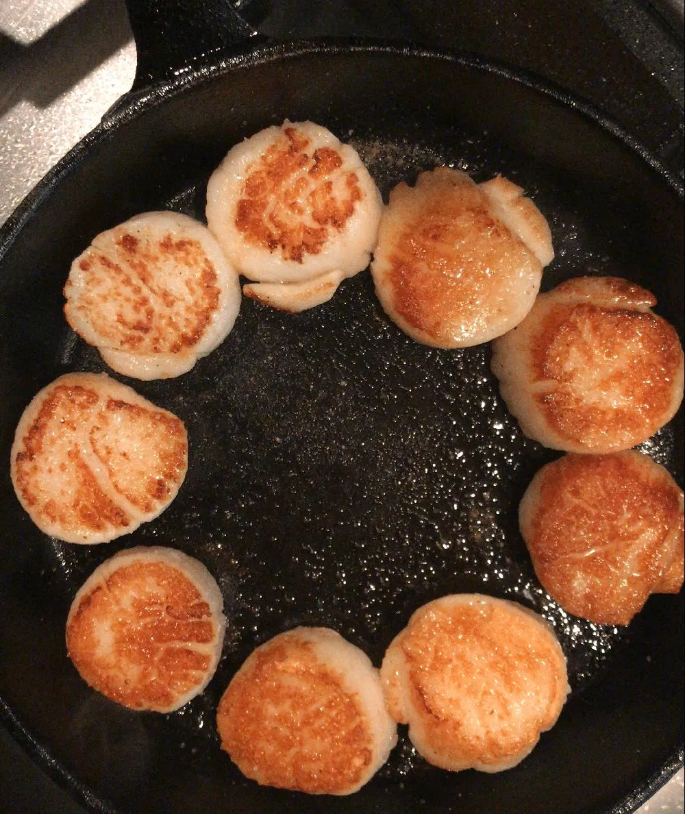 - Once the oil on the pan starts to smoke a little bit, carefully add the scallops one by one. Spread them out in a circle on the outer part of the pan (refer to the picture above).